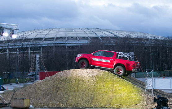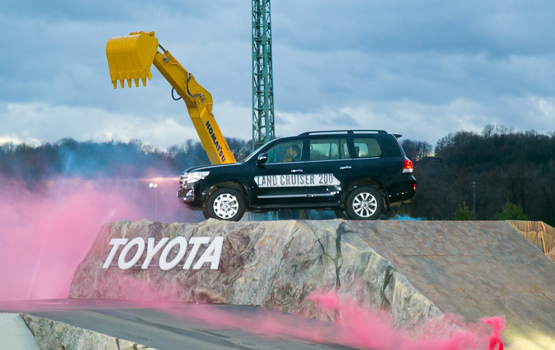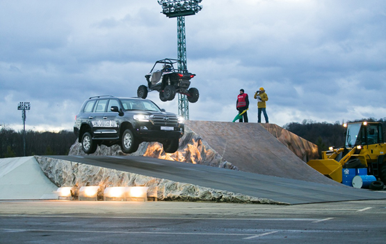 В захватывающем шоу приняли участие внедорожники прошлых лет, демонстрирующие богатое наследие Toyota, а также современные представители прославленных семейств Hilux и Land Cruiser с инновационным оснащением. Вместе с внедорожниками в представлении участвовала дорожно-строительная техника партнера мероприятия – KOMATSU, а также багги и квадроциклы, которые не только соревновались с огромными внедорожниками в исполнении сложнейших трюков под управлением профессиональных каскадеров, но и перемещались по трассе в кузове Toyota Hilux.